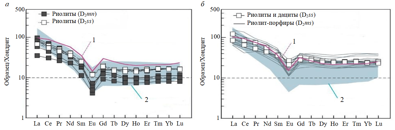 Геохимическая классификация измененных горных пород основана на относительно неподвижных элементах, которые наименее подвержены воздействию постмагматических процессов, включая обстановки морского дна и метаморфизм до уровня амфиболитовой фации. В подводных обстановках элементы ряда легких лантаноидов (LREE – La-Sm, включая Eu) более эффективно поддаются выщелачиванию и подвижности, чем тяжелые (HREE – Er-Lu, включая Y) [25], особенно в условиях, когда движение гидротермальных флюидов сосредоточено вдоль хорошо проницаемых зон, где реализуются высокие соотношения флюид/порода. На основании классификации с высокозарядными элементами (Zr, Nb, Y, Ti), немобильными в гидротермальном флюиде при низких степенях метаморфизма, составы вулканических пород мельничной и сосновской свит принципиально не различаются, соответствуя полю составов риолитов, реже дацитов, в пределах диапазона составов нормальной щелочности (рис.4, в). Вариации LREE концентраций по отношению к HREE (La/Ybn = 1,12-12,6) имеют широкий диапазон от толеитовой до известково-щелочной серий (рис.4, г): известково-щелочная серия – La/Yb > 5; переходные составы – La/Yb ~3-5; толеитовая серия – La/Yb < 3. Однако нормализованные к хондриту REE спектры (рис.5, а, б) [34] имеют общий когерентный характер, что допускает их использование для интерпретаций. Анализ немобильных элементов (см. рис.4, д)[4-6] показывает, что фигуративные точки составов лежат преимущественно в поле толеитовой серии с уклоном в сторону известково-щелочной, поскольку имеют относительно низкие значения своих индикаторных отношений (Zr/Y = 3-6,6, Zr < 350 ppm). Очевидно, что обсуждаемые геохимические типы по своей природе не были перщелочными, о чем свидетельствуют индикаторные соотношения Nb/Y (< 0,52) и относительно низкие концентрации Nb (< 12 ppm); рис.4, е) [29]. Также маловероятно, что их родительские магмы не могли быть пералюминиевой природы, поскольку изученные составы имеют положительную эволюционную тенденцию в распределении значений Ga/Al (рис.4, ж), отличаясь от высокофракционированных кислых магм S- и I-типа [30]. Суммарные концентрации Nb, Y, Zr и Ce (< 347 ppm) в совокупности с низкими значениями Ga/Al отношения (1,26-3,52) и содержаниями Zn (9-187 ppm) указывают на принадлежность изученных пород к области составов I-S-типа вблизи области составов А2-типа. Содержания крупноионных литофильных элементов (LILE: Rb, Ba, Cs, Sr) демонстрируют более значимые вариации в одном и том же типе сильно измененных пород, что соответствует их высокой подвижности при гидротермальных процессах [25]. Например, соотношение Rb/Sr для слабоизмененных пород варьирует от 0,02 до 1,2, в сильноизмененных разновидностях – от 0,4 до 6,0. В большинстве случаев область распределения составов имеет близкое сродство с ранее изученными субвулканическими риолитами мельнично-сосновского вулканического комплекса [20], которые обладают более выраженными переходными геохимическими характеристиками между островодужными и внутриплитными магматическими формациями.