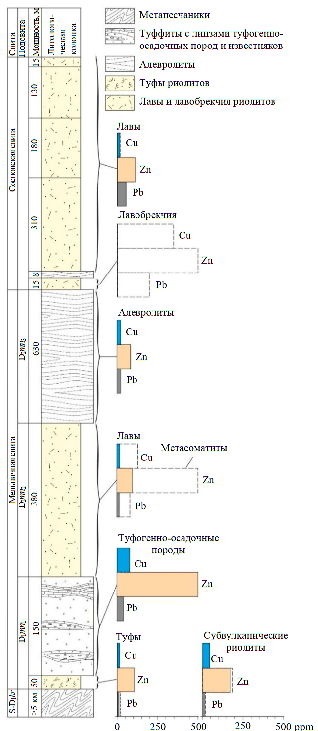 Для мельничной свиты характерны минимальные концентрации Zn, Pb, Cu (до 1164, 78, 162 г/т соответственно) при максимальных концентрациях As (до 52 г/т). В сосновской свите наблюдается обратное распределение этих компонентов (Zn до 15648; Pb до 307; Cu до 497; As до 3 г/т). Более высокие содержания As в мельничной свите связаны с ранними диагенетическими процессами преобразования осадков на небольших глубинах, что характерно для ряда вулканогенно-гидротермальных месторождений, образованных в мелководно-морских условиях [32]. Напротив, высокие содержания Zn, Pb и Cu в сосновской свите соответствуют имеющимся данным об их связи с эндогенными процессами (магматической активностью) [17]. Увеличение содержаний Zn в разрезе указывает на нарастающую активность вулканизма в связи с прогрессирующими рифтогенными процессами – большая часть вулканогенных и вулканогенно-осадочных отложений комплекса имеет повышенные содержания Zn (свыше 60 г/т), что характерно для рифтогенных (A-тип) кислых магм окраинно-континентальных обстановок [4-6].