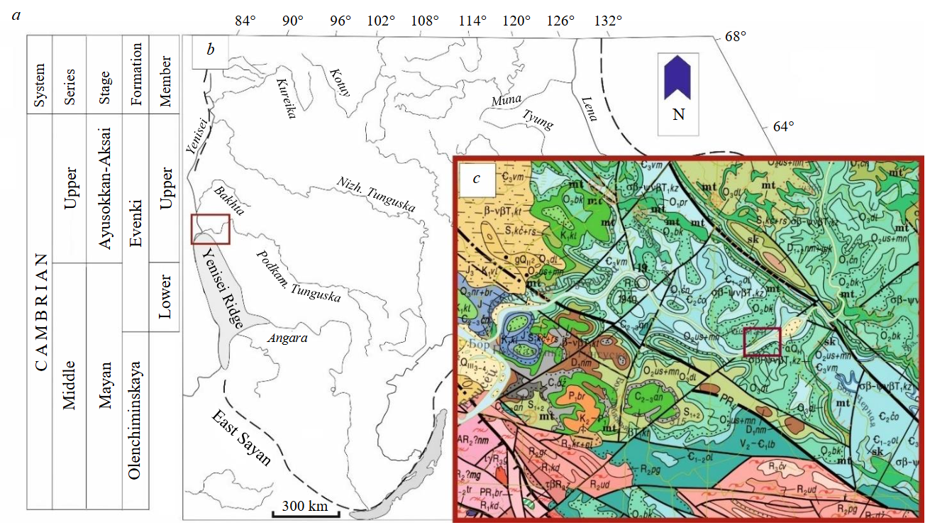 Determining the formation conditions of lagoon, sabkha, tidal flat, and other transitional zone deposits between land and marine basins is one of the most challenging problems in the study Paleozoic and earlier deposits. Despite active research on terrigenous-carbonate and carbonate-evaporite sequences formed in coastal-shallow marine and subaerial settings of the interior of the Siberian Platform, Cambrian sections remain insufficiently studied due to difficulties in dating the deposits and the significant uniqueness of the facies, which lack modern analogues.