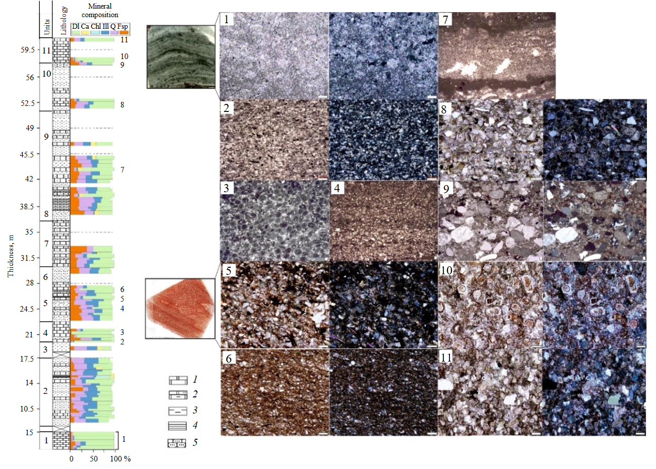 Genetic interpretation of the identified lithology types. Among the genetic features of the identified types, the widespread development of dolomites with stromatolitic texture and/or bacterial structures (remains of calcimicrobes Renalcis, micro-oncolites, katagraphs, clots, peloids) is noted. In certain types, signs of subaerial exposure of the sediment are present in the form of weakly expressed microkarst (SL-1/6 (see Fig.2, thin section 1), SL-6/43 (see Fig.2, thin section 7), as well as fenestral structures typical of tidal flat settings (SL-6/43). In the carbonate-terrigenous varieties, variations in the granulometric composition of the silt-sandy component and its distribution along laminae are observed (SL-6/18 (see Fig.2, thin section 4), enrichment of individual layers with medium- to coarse-sandy aluminosilicate clastic material (SL-6/51 (see Fig.2, thin section 9) or very fine-sandy-silty micaceous material (SL-6/54 (see Fig.2, thin section 11), the presence of poorly expressed cross and graded bedding, flaser-horizontal texture, as well as con-sedimentary deformations (SL-6/20 (see Fig.2, thin section 5), indicating variations in the hydrodynamic regime and sedimentation mode, increased input of terrigenous material or its redistribution within the sedimentation basin. In the upper part of the section (SL-6/49, SL-6/53 (see Fig.2, thin sections 8, 10), gypsum is detected. The depositional settings are reconstructed as sublittoral, littoral (tidal flat), and possibly sabkha (in the upper part of the section).