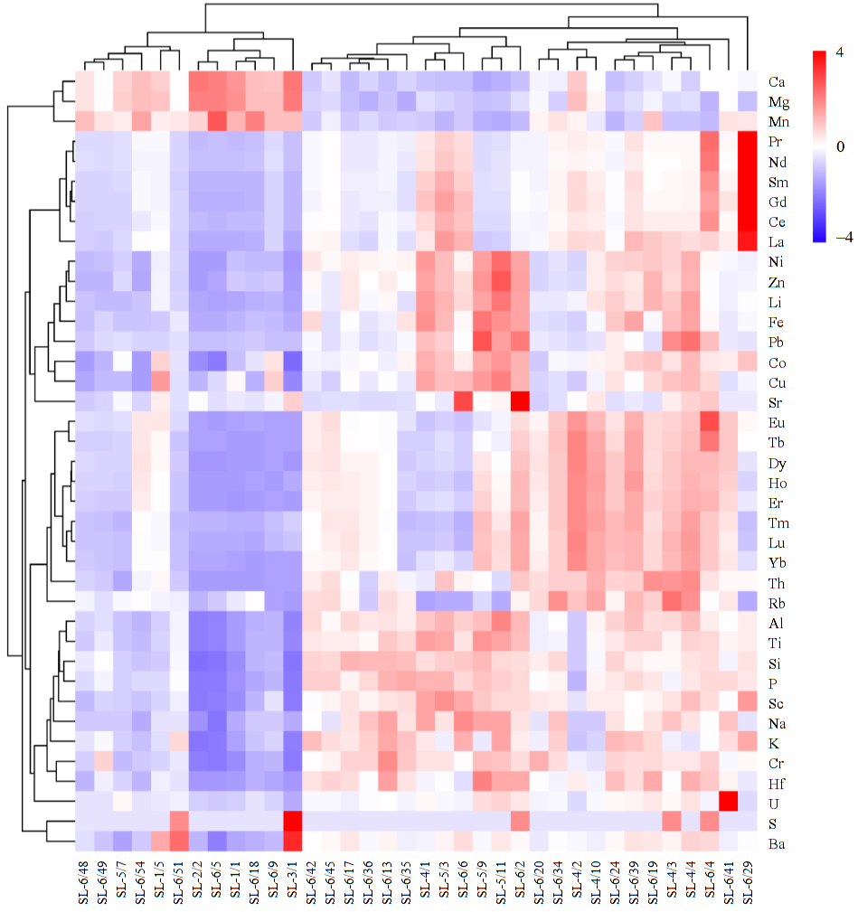 As statistical tools for interpreting the trace element data, a heat map with complete-linkage clustering and Pearson correlation coefficients were used. The heat map is based on a method for detecting outliers in a data array [13].