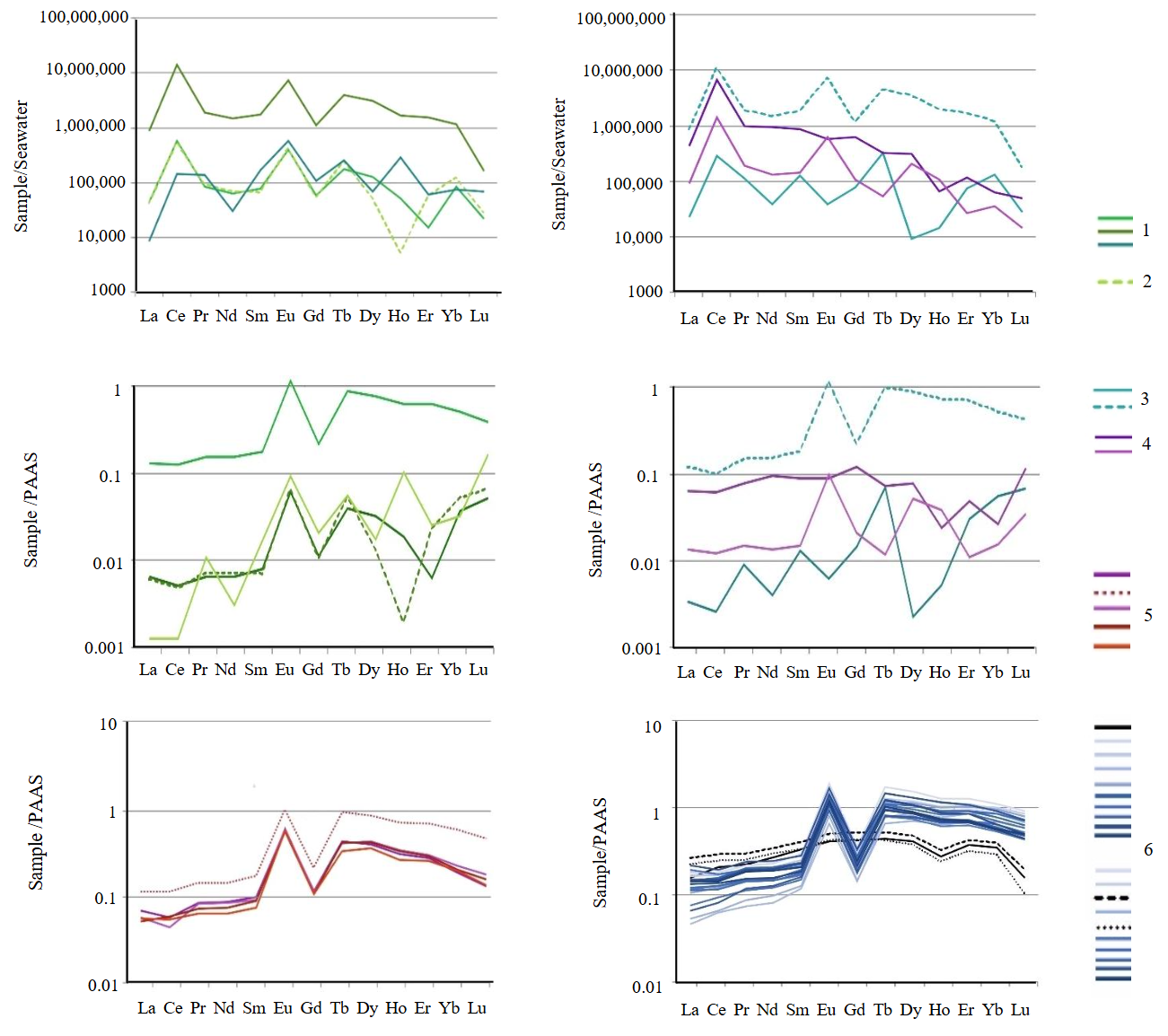 Along with traditional normalization to NASC or PAAS, normalization of dolomites to the composition of modern seawater is justified [30, 31]. The recrystallization process can lead to changes in total REE concentrations but does not alter the overall REE distribution, including enrichment in CeSN (SN – seawater normalized) and LREE [30]. However, the influence of meteoric waters can lead to a change in the magnitude of the Ce anomaly, and the impact of hydrothermal fluids is reflected in complex fluctuations on the REE spider diagram and in the emergence of a positive Eu anomaly [30].