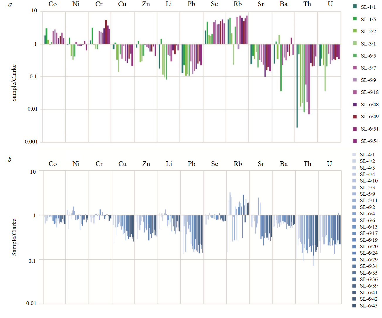 Relative to the Clarke values for carbonate rocks [45], the studied deposits are noticeably enriched in Co, Cr, Sc, Rb and depleted in Cu, Zn, Li, Ba (except for sample SL-1/5, which is enriched in these elements), as well as Pb and Sr (Fig.6, а). Primarily, the relative variations in depletion/enrichment characterize the elemental composition of the terrigenous admixture. Due to the presence of up to 40 % dolomitic cement in the sandstones and their location in the same cluster with the dolomites, samples SL-6/51 and SL-6/49 were also normalized against carbonate rocks.