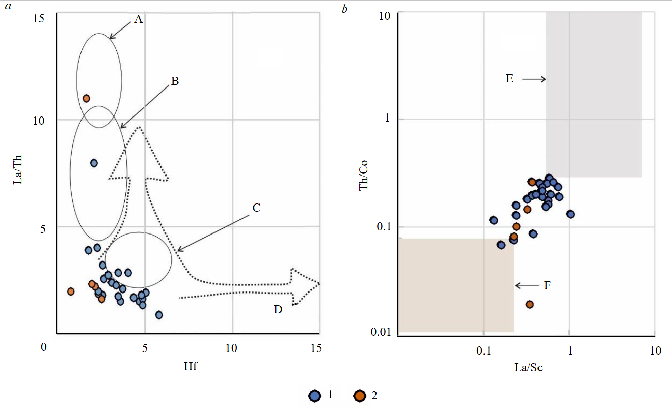 The Hf-La/Th plot [46] allows distinguishing the compositional fields of sedimentary formations formed by the erosion of oceanic islands composed of tholetitic basalts A, andesites B, or acid volcanics C, and also shows areas of mixing of clastics from these rock types D (Fig.7, а). In Fig.7, а the composition points of the carbonate-terrigenous rocks of the Evenki Formation fall within the field of felsic sources. Sample SL-6/29 stands out, falling into the field of formations formed by the erosion of island arcs with a predominance of andesites. This sample is characterized by the highest LREE/HREE ratio and total REE content in the sample set. Sample SL-5/7 falls into the field of formations formed by the erosion of oceanic islands with a predominance of tholetitic basalts. On the La/Sc-Th/Co plot [47] (Fig.7, b), the composition of the Evenki Formation rocks demonstrates a mixed source – products of the erosion of rocks of both acidic E and basic F composition.