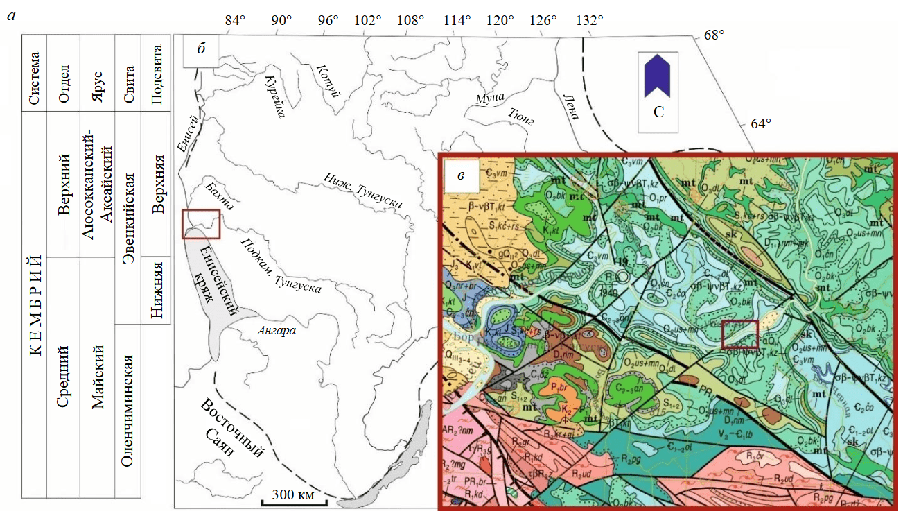 В Байкитской зоне эвенкийская свита подразделяется на две подсвиты [1], либо выделяют черноостровскую и вельминскую свиты в составе эвенкийской серии (рис.1, а), которые согласно залегают на породах оленчиминской свиты. Нижняя подсвита (220-325 м) в основании состоит из однообразных красных и реже зеленых алевритистых доломитовых мергелей, часто соленосных и сульфатоносных, с серыми глинистыми доломитами и известняками. Верхняя ее пачка имеет более терригенный состав, преобладают доломитистые аргиллиты, алевролиты, мергели, песчаники [1]. В отличие от нижней подсвиты, верхняя (190-205 м) более карбонатная и включает красноцветные доломиты, доломитовые мергели и алевролиты, с вишнево-бурыми и зеленоватыми мергелями и прослоями аргиллитов. Нижняя подсвита относится к майскому ярусу среднего кембрия, верхняя – к верхнему кембрию [1, 2].