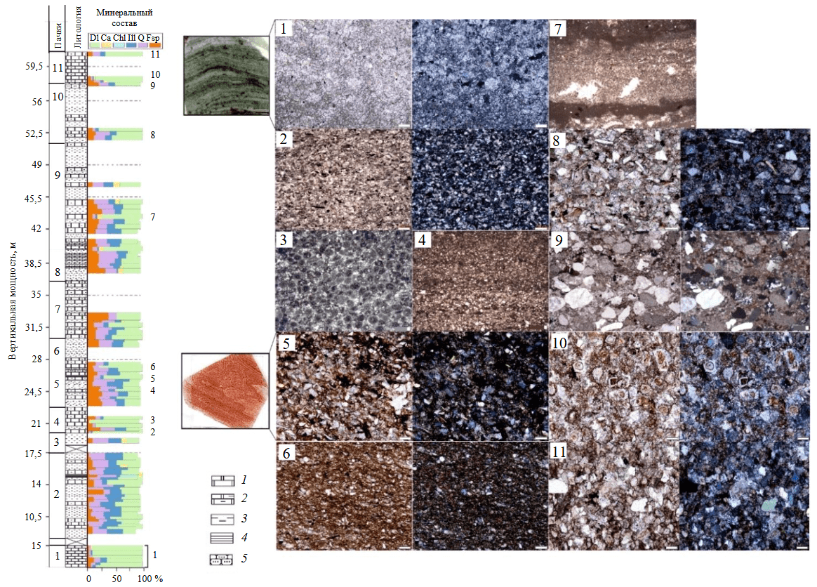 Генетическая интерпретация выделенных литотипов. Среди генетических особенностей выделенных литотипов отмечается широкое развитие доломитов со строматолитовой текстурой и/или бактериальными структурами (остатки кальцимикробов Renalcis, микроонколиты, катаграфии, комки, сгустки). В отдельных литотипах присутствуют признаки субаэральной экспозиции осадка в виде слабовыраженного микрокарста (SL-1/6 (см. рис.2, шлиф 1), SL-6/43 (см. рис.2, шлиф 7), а также типичные для приливно-отливных обстановок фенестровые структуры (SL-6/43). В карбонатно-терригенных разностях прослеживается изменение гранулометрического состава алевро-песчаной компоненты, ее распределения по слойкам (SL-6/18 (см. рис.2, шлиф 4), обогащение отдельных слоев средне-крупнопесчаным алюмосиликокластическим материалом (SL-6/51 (см. рис.2, шлиф 9) или тонкопесчано-алевритовым слюдистым материалом (SL-6/54 (см. рис.2, шлиф 11), наличие плохо выраженной косой и градационной слоистости, штриховатой горизонтальной текстуры, а также конседиментационных деформаций (SL-6/20 (см. рис.2, шлиф 5), свидетельствующих о вариациях гидродинамического режима и способа накопления осадка, усилении привноса терригенного материала или перераспределения его в бассейне седиментации. В верхней части разреза (SL-6/49, SL-6/53 (см. рис.2, шлифы 8, 10) обнаруживается гипс. Восстанавливаются обстановки седиментации – сублиторальные, литоральные (приливно-отливные), возможно, себховые (в верхней части разреза).