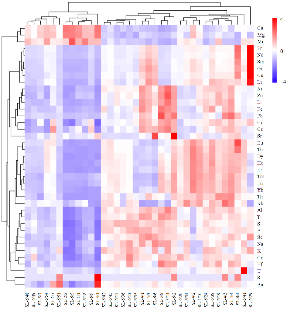 Изучен элементный состав карбонатных (доломиты) и терригенных (алевролиты доломитовые и аргиллиты доломитистые, песчаники и алевро-песчаники аркозовые с базальным доломитовым цементом) пород. С помощью тепловой карты и кластеризации визуализирован общий характер распределения микроэлементов. Карбонатные литотипы заметно обогащены Co, Cr, Sc, Rb и обеднены Cu, Zn, Li, Ba, Pb и Sr относительно кларка в карбонатах. В обломочной части доломитов присутствуют кварц, ПШ (ортоклазы, кислые плагиоклазы), слюды (биотит и мусковит), фрагменты гнейсов, кварцитов, кислых эффузивов, железистых силицитов, сидеритов.