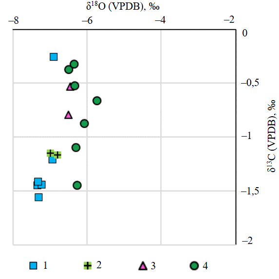 На диаграмме δ18О-δ13С (рис.4) точки составов доломитов четырех описанных литотипов не образуют обособленных скоплений, но отмечается схожий изотопный состав доломитов со строматолитовой текстурой и доломитов замещения кристаллических без сохранения первичных структур протолита. Для этих двух литотипов δ18O находится в пределах от –6,8 до –7,3 ‰. По δ13C выделяется образец SL-3/1, для остальных доломитов этих групп данный параметр находится в интервале от –1,4 до –1,1 ‰. Доломиты замещения разнокристаллические с реликтовой алевро-пелитовой структурой протолита отличаются относительно широкими вариациями δ13C – от –1,4 до –0,3 ‰. Промежуточное положение на диаграмме занимают доломиты комковато-сгустковые.