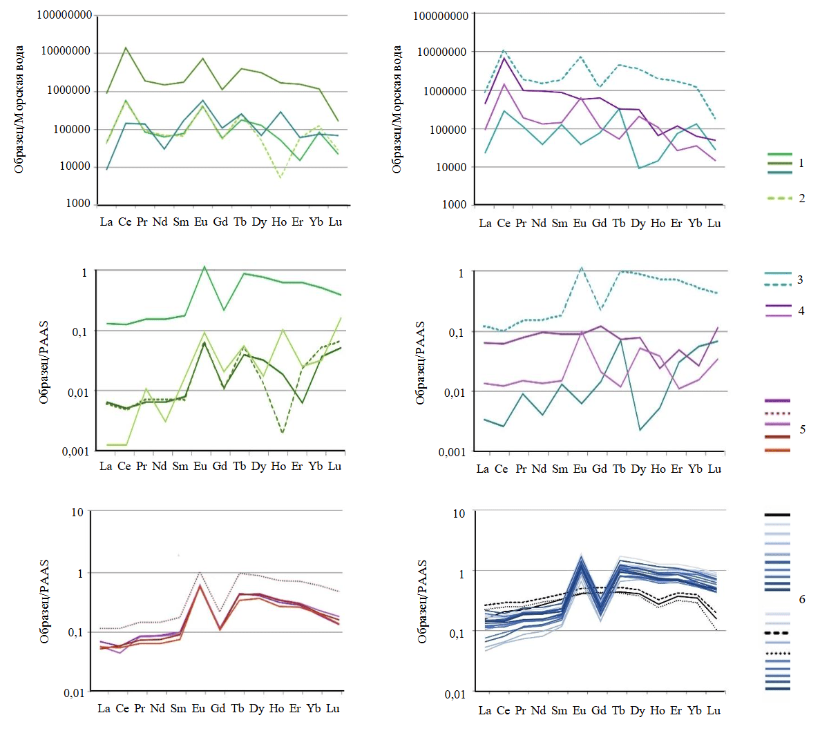 Наряду с традиционным нормированием на NASC или PAAS, оправдано нормирование доломитов на состав современной морской воды [30, 31]. Процесс перекристаллизации может привести к изменению суммарных концентраций РЗЭ, но не меняет общее распределение РЗЭ, включая обогащение CeSN (SN – seawater normalized) и ЛРЗЭ [30]. Воздействие же метеорных вод может привести к изменению величины аномалии Ce, а влияние гидротермальных флюидов отражается в сложных флуктуациях на спайдер-диаграмме РЗЭ и на возникновении положительной аномалии Eu [30].