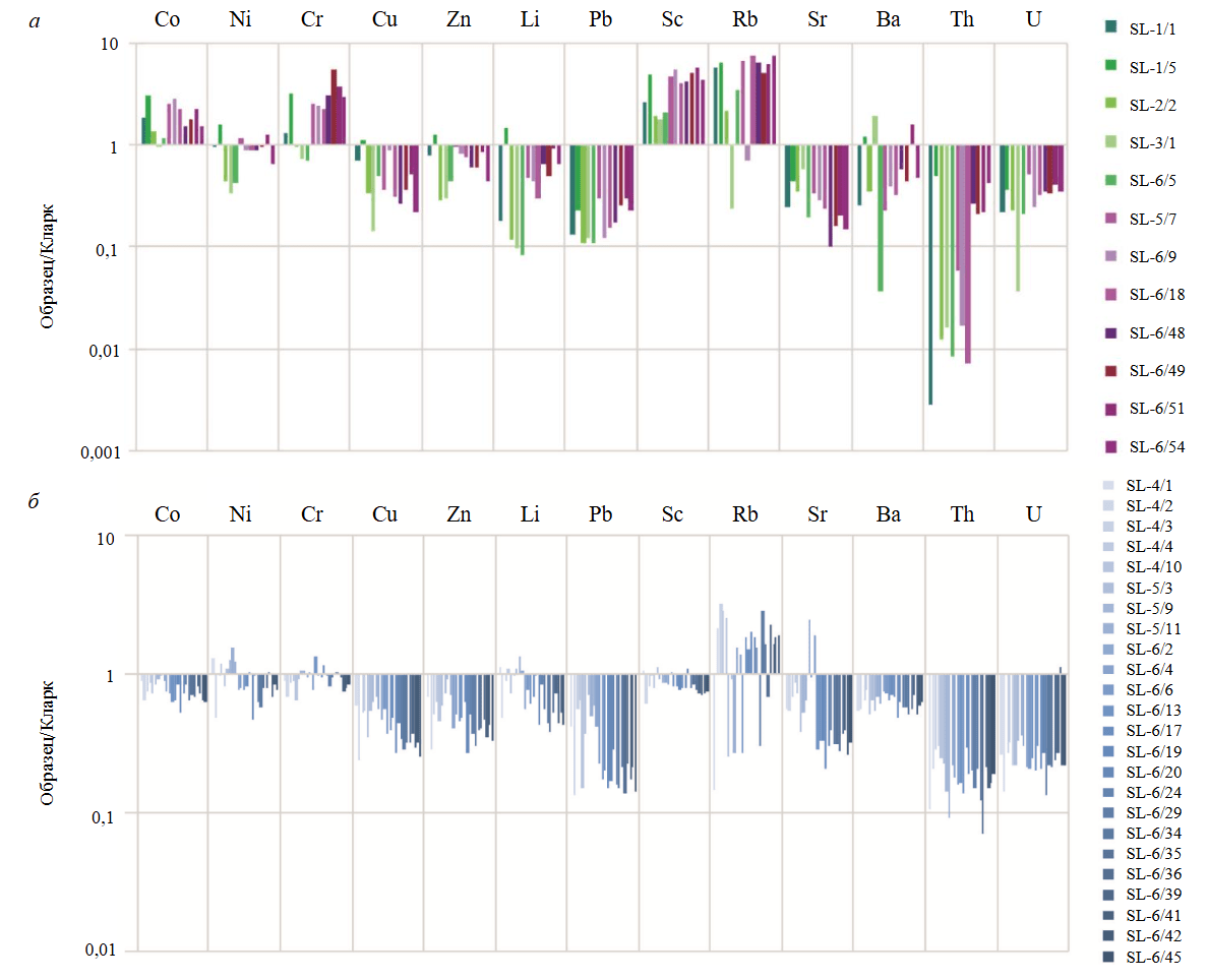 Относительно кларка для глин и глинистых сланцев [45] изучаемые породы обеднены Cu, Zn, Pb, Ba, Th, U, как и описанные карбонатные литотипы, кроме образца SL-6/41, слабо обогащенного ураном. Наблюдается значительное обогащение отдельных образцов Rb и Sr, а концентрации Co, Ni, Cr, Sc близки к кларковым с незначительным обеднением или обогащением этими элементами (рис.6, б).