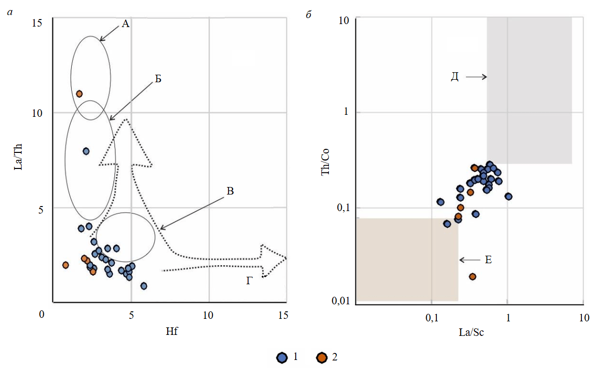 Диаграмма Hf-La/ Th [46] позволяет разграничить поля состава осадочных образований, сформированных за счет разрушения океанических островов, сложенных толеитовыми базальтами А, андезитами Б, либо кислыми вулканитами В, а также показывает области смешения кластики из этих типов пород Г (рис.7, а). На рис.7, а точки состава карбонатно-терригенных пород эвенкийской свиты попадают в поле фельзитовых источников. Выделяется образец SL-6/29, попадающий в поле образований, сформированных при разрушении островных дуг с преобладанием андезитов. Для этого образца характерно максимальное среди выборки отношение ЛРЗЭ/ТРЗЭ и общая сумма РЗЭ. Образец SL-5/7 попадает в поле образований, сформированных за счет разрушения океанических островов с преобладанием толеитовых базальтов. На диаграмме La/Sc-Th/Co [47] (рис.7, б) состав пород эвенкийской свиты демонстрирует смешанный источник – продукты разрушения пород кислого Д и основного Е составов.