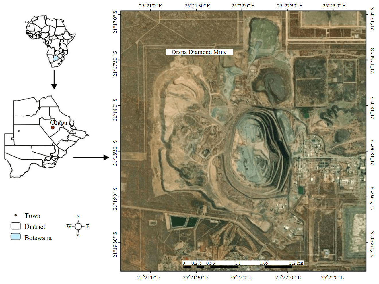 Orapa Diamond Mine is situated in Botswana, Southern Africa (Fig.1). The mine’s resources include a single volcanic pipe that splits into deep north and south pipes, penetrating through Transvaal strata and Karoo sediments formed over 200 million years ago. The blasting operations employ a staggered pattern and primarily use two types of explosives: A and B. The bench height is 15 m, with blast holes that have diameters of 127, 165, and 250 mm. A typical row contains between 40 and 60 holes, and each blast involves 15 to 25 rows. Shovels, excavators, and rear dump trucks handle the blasted materials within the pit. Presently, the mining operations at Orapa reach a depth of 305 m and are projected to attain a depth of 350 m by 2026. Production fluctuates per mining plan, averaging about 2000 kg annually.