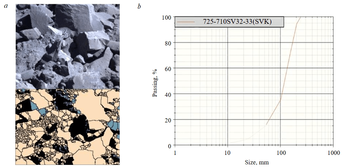 Fig.2. Muck pile image (a) and the Split Desktop PSD curve (b)