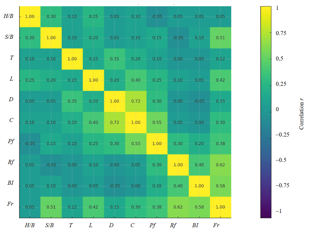 Relationships among inputs align with practical design linkages. D-C (r ≈ 0.72) is highest because larger holes accommodate higher charge mass; C-Pf (r ≈ 0.55) follows since Pf scales with charge per rock volume. T-D (r ≈ 0.35) reflects scaling of stemming to hole size to preserve gas sealing, while H/B-S/B (r ≈ 0.30) co-moves because both ratios share the burden term. Overall, the matrix suggests that rock characteristics (Rf, BI) set the baseline fragmentation response, while geometry S/B and energy intensity (Pf, L, via C) act as the primary controllable levers. As this is a linear summary, non-linear or threshold effects common in blast geometry may be under-represented, so these correlations should be read as transparent guidance for design tuning rather than strict causal claims.