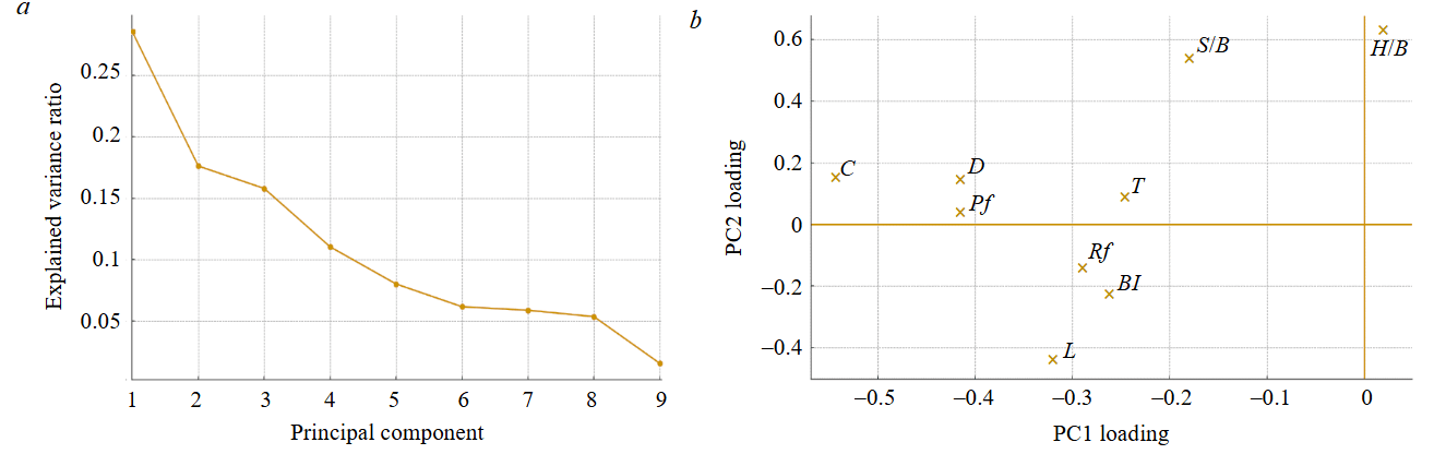 Fig.4. Principal component analysis: а – explained variance of the PCA components; b – PC1 and PC2 loadings