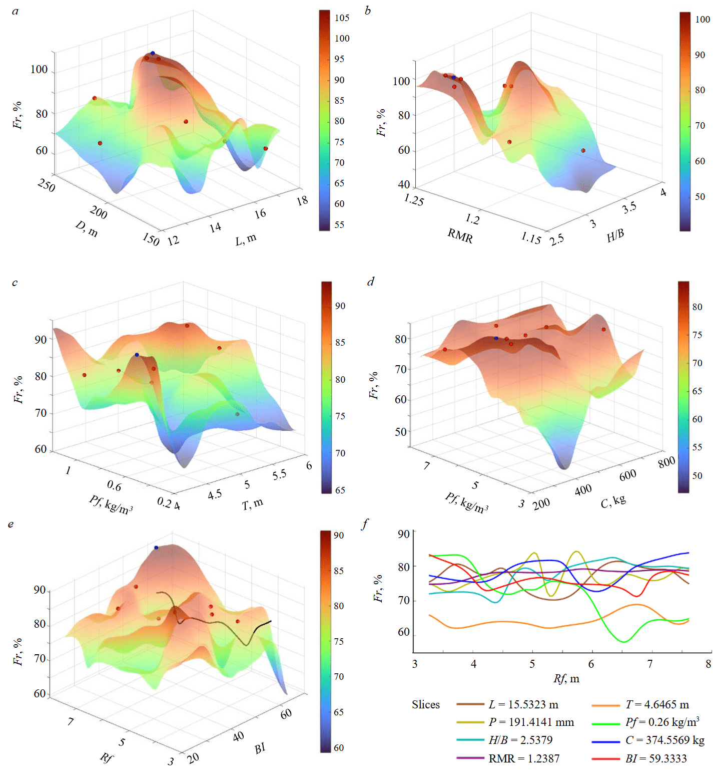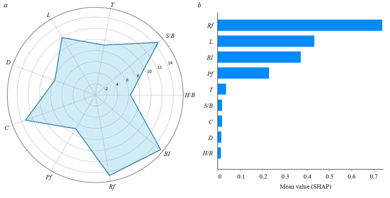Figure 6, b presents the mean absolute SHAP values for fragmentation Fr, illustrating the ave-rage contribution of each input parameter to the model’s prediction. SHAP is a unified framework based on cooperative game theory that explains individual predictions by computing the contribution of each feature relative to a baseline expectation [38]. From the figure, rock factor Rf emerges as the most influential parameter, followed by hole depth L, blastability index BI, and powder factor Pf. Other parameters such as stemming T, stiffness ratio H/B and hole diameter D have lower impacts.