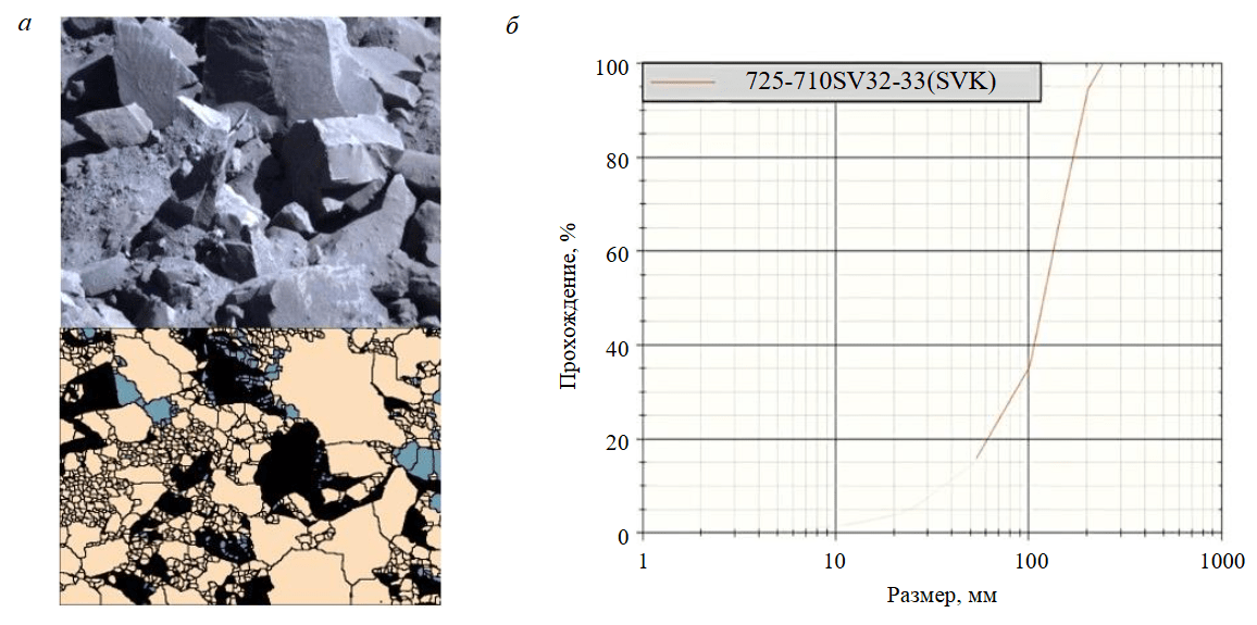 Предварительная обработка данных была выполнена в первую очередь для обеспечения качества и согласованности набора данных. В нее вошли очистка, в ходе которой обрабатывались пропущенные или несогласованные значения, а также нормализация, при которой все входные параметры приводились к единому диапазону для предотвращения доминирования в процессе обучения характеристик с большими величинами. Набор данных был разделен на две подвыборки: 80 % для обучения и 20 % для тестирования. Обучающая часть дополнительно подвергалась шестикратной кросс-валидации, при которой данные разделялись на шесть равных частей (примерно по 20 образцов в каждой), пять частей использовались для обучения модели, а одна часть – для валидации. Процесс повторялся шесть раз, чтобы каждый образец участвовал как в обучении, так и в валидации. Предварительная обработка данных также включала построение корреляционной матрицы и анализ главных компонент. Для оценки моделей использовались показатели эффективности – среднеквадратичная ошибка (СКО), R2 и средняя абсолютная ошибка (САО). Программное обеспечение Split Desktop применялось при анализе и построения кривой распределения частиц по размерам (PSD) для оценки степени дробления (с помощью изображений, полученных с цифровой камеры). Качество дробления на руднике оценивается на основе показателя 76 %-ного прохождения через сито частиц размером 150 мм, при этом размер менее 50 мм считается мелким, а более 150 мм – крупным. На рис.2 представлены изображение отвала горной массы и кривая PSD, полученная с помощью программного обеспечения Split Desktop.