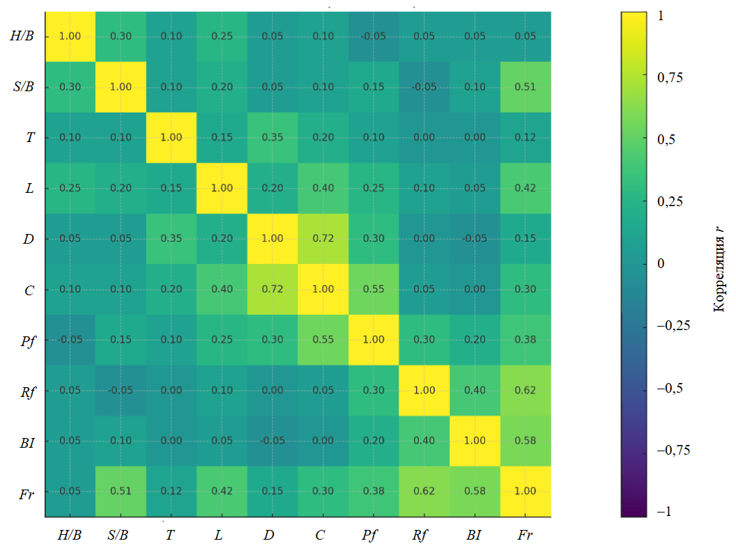 Взаимосвязи между входными параметрами соответствуют практическим связям в проектировании работ. Наивысшая степень корреляции наблюдается между D и C (r ≈ 0,72), поскольку скважины большего диаметра вмещают большую массу заряда. Следом идет C и Pf (r ≈ 0,55), так как Pf зависит от массы заряда на единицу объема породы. Связь между T и D (r ≈ 0,35) отражает масштабирование забойки в соответствии с размером скважины для сохранения герметизации газов, в то время как H/B-S/B (r ≈ 0,30) изменяются совместно, поскольку оба коэффициента содержат параметр ЛНС. В целом матрица показывает, что характеристики породы (Rf, BI) задают базовый уровень дробления, в то время как геометрия (S/B) и энергонасыщенность (Pf, L через C) выступают основными управляемыми параметрами. Поскольку это линейный вид, нелинейные эффекты или пороговые значения, характерные для геометрии взрыва, могут быть представлены недостаточно полно. Поэтому данные корреляции следует рассматривать как наглядное руководство для отладки проектирования взрыва, а не как строгие причинно-следственные утверждения.