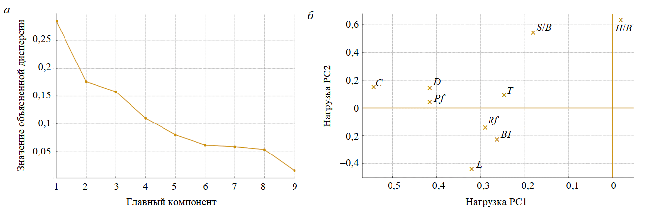 Рис.4. Анализ главных компонент: а – объясненная дисперсия компонент PCA; б – нагрузки PC1 и PC2