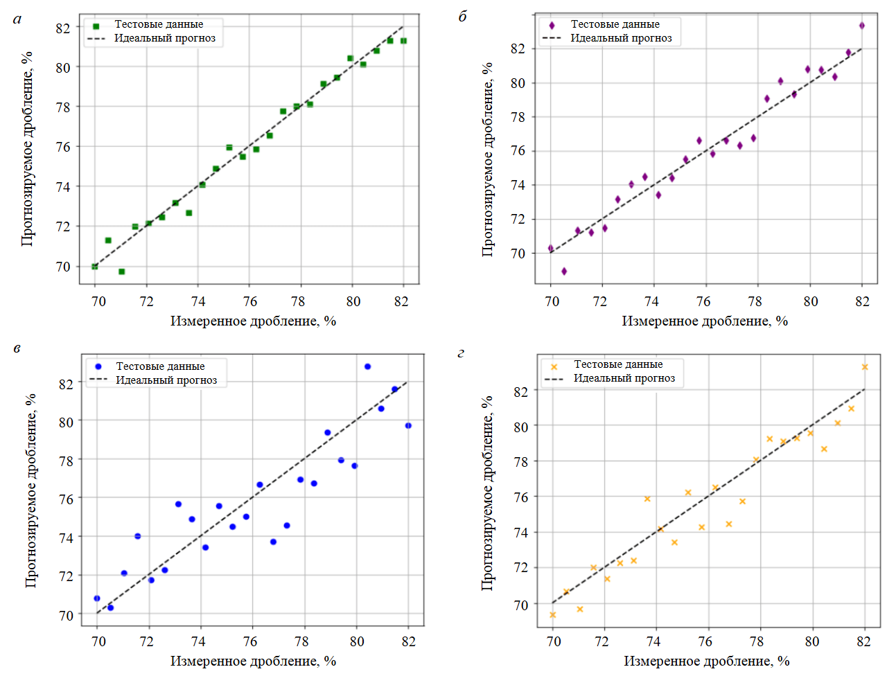 Рис.5. Диаграммы рассеяния для изучаемых моделей: а – PSO-ANN; б – GA-ANN; в – ANN; г – ANFIS