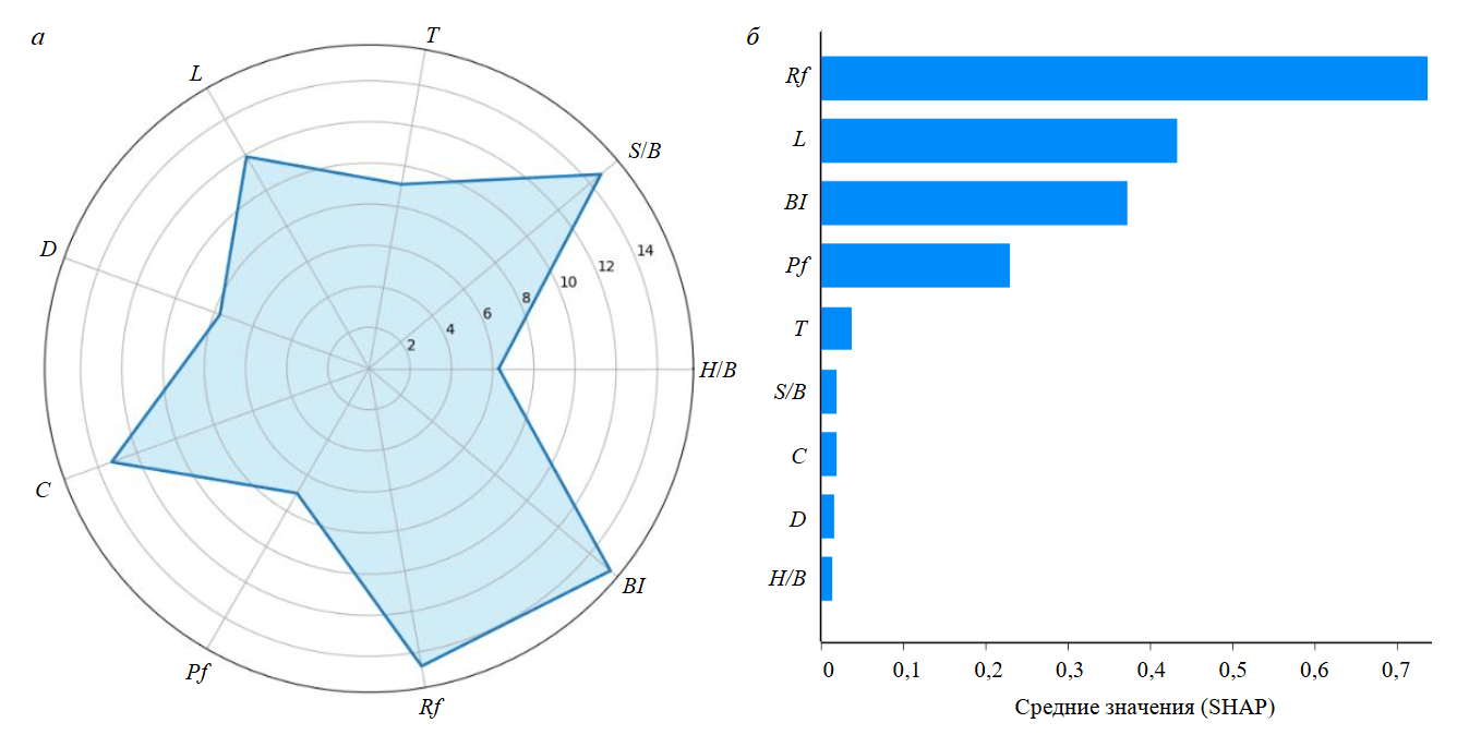 Рис.6, б демонстрирует средние абсолютные значения SHAP для дробления Fr, показывая средний вклад каждого входного параметра в прогноз модели. SHAP – это единая структура, основанная на теории кооперативных игр, которая объясняет отдельные прогнозы путем вычисления вклада каждого признака относительно базового ожидаемого значения [38]. Согласно представленному графику, наиболее значимым параметром является коэффициент крепости породы Rf, за которым следуют глубина скважины L; индекс взрываемости BI; расход взрывчатого вещества Pf. Другие параметры, такие как забойка T, коэффициент жесткости H/B и диаметр скважины D оказывают меньшее влияние на результат.