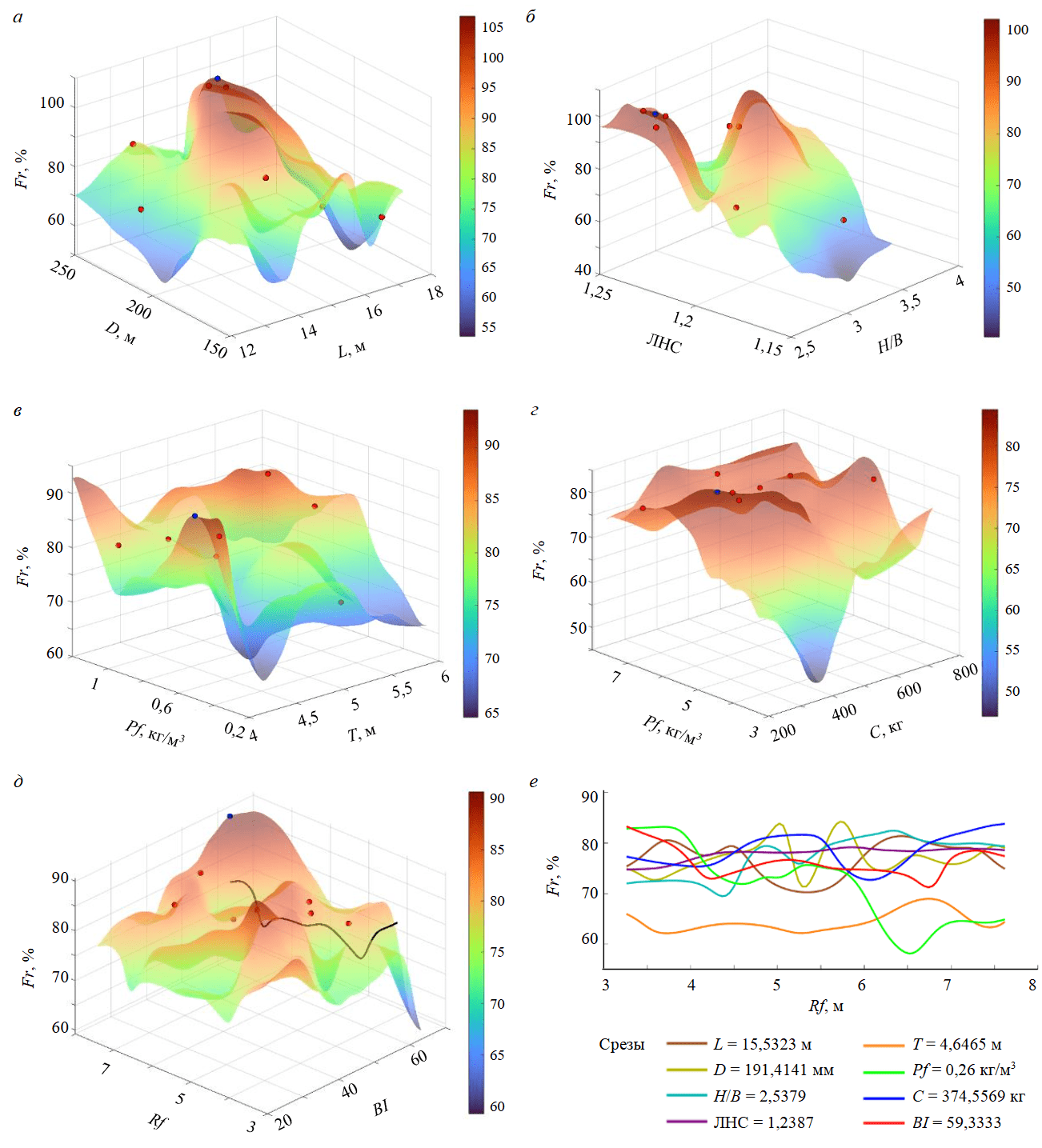 Рис.7. Пространство решений для дробления породы как выходного и входных параметров, взятых по два – зависимости диаметра и глубины отверстия от дробления Fr (а); соотношения расстояния к заряду и жесткости от Fr (б); коэффициента расхода взрывчатого вещества и забойки от Fr (в); коэффициента крепости породы и заряда на интервал замедления от Fr (г); коэффициента крепости породы и индекса взрываемости от Fr (д); совмещенный график для двумерных срезов (е)
