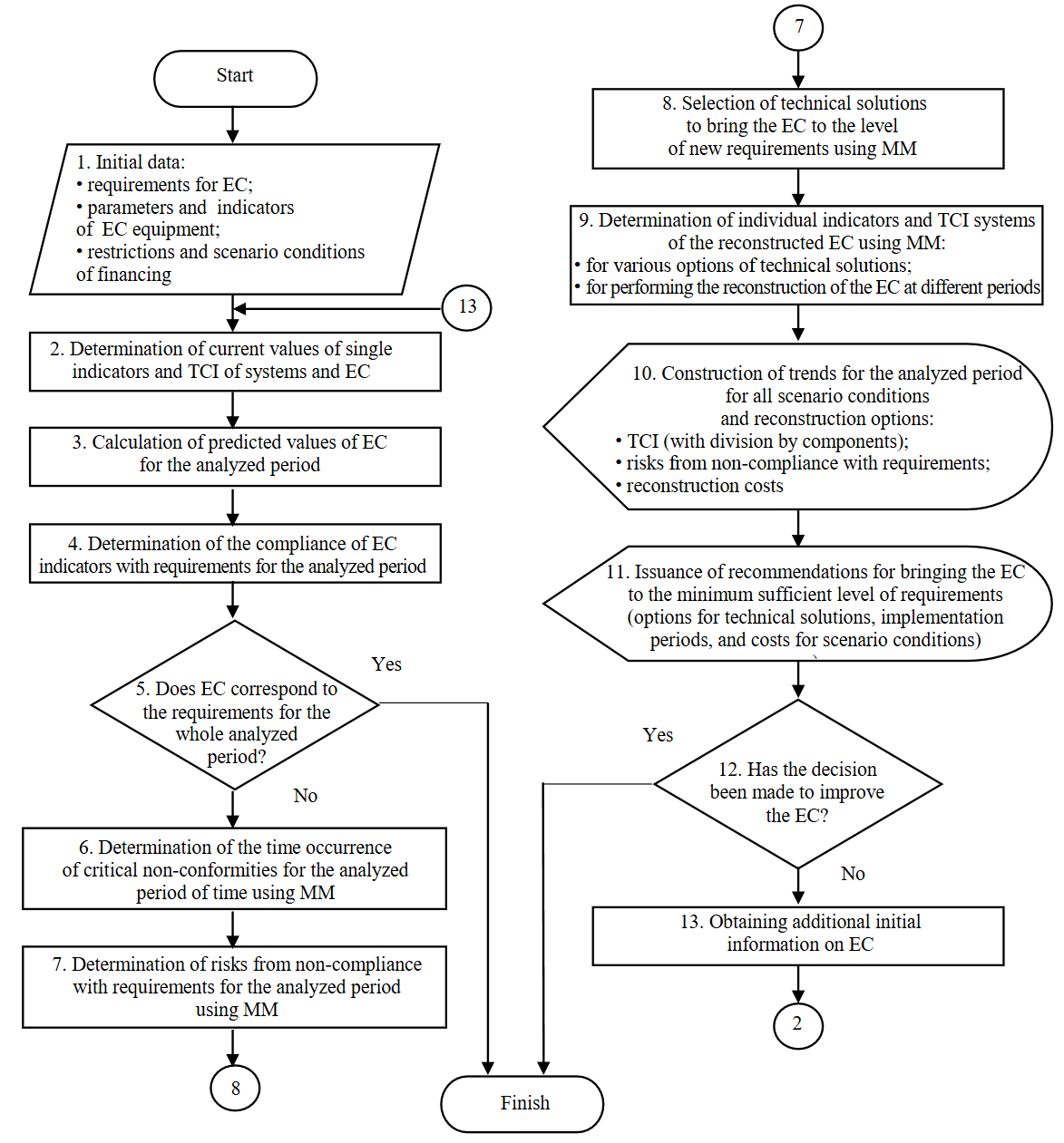 The developed augmented algorithm of mathematical models for determining the TCI of a single EC assumes that the existing EC or PFECs, after reconstruction, meet the new requirements over the whole analyzed period, assessment of the risks from the mismatch of EC indicators with new requirements, as well as a set of tools for constructing trends in indicators and corresponding reconstruction costs and risk profiles to make an informed decision on the strategic development of PFEC.