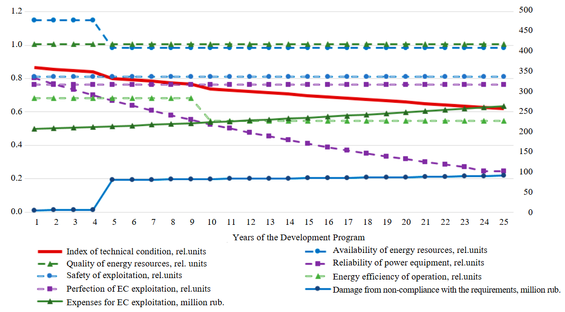 For each of the selected options for technical solutions, the criterion indicators of the reconstructed energy complex, the reconstruction costs with possible time scenarios for its implementation are determined, the corresponding trends are built for the entire analyzed period and recommendations are formed for bringing the EC indicators to the minimum sufficient level of requirements.