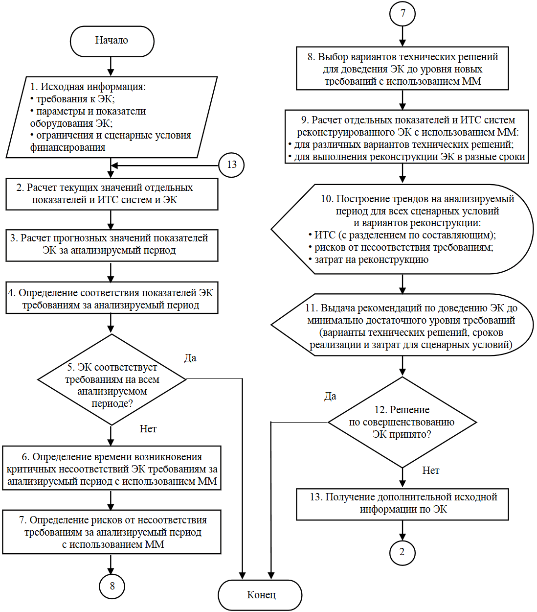 Разработанный укрупненный алгоритм применения математических моделей для определения ИТС одиночного ЭК предполагает определение соответствия показателей существующих ЭК или ЭК ПрОб после их реконструкции новым требованиям на всем анализируемом периоде, оценку рисков от несоответствия показателей ЭК новым требованиям, а также комплекс процедур для построения трендов показателей и соответствующих им затрат на реконструкцию и величин рисков для принятия обоснованного решения по стратегическому развитию ЭК ПрОб.