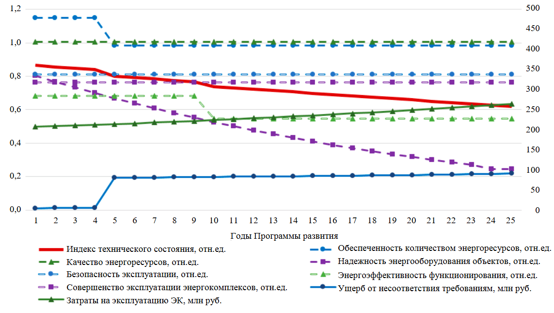 В качестве примера на рис.3 приведены результаты расчета составляющих ИТС, выполненные с использованием разработанных моделей при условиях: роста нагрузки на СЭС на 20 % на пятом году реализации Программы развития, вызванного увеличением подачи природного газа потребителю, и повышения требований по энергоэффективности оборудования ЭК на 20 % на десятом году, связанного с вводом в действие новых нормативных документов.