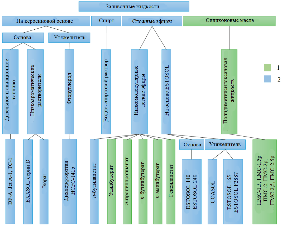 Низкотемпературные жидкости можно разделить на четыре основные группы (рис.1): двухкомпонентные жидкости на основе углеводородов с добавлением утяжелителя, спиртовые соединения, сложноэфирные соединения и силиконовые масла [20, 21]. Большинство этих жидкостей являются экологически небезопасными. Например, наиболее распространенная ЗЖ – смесь углеводородов, используемая в скважине 5Г, несмотря на преимущества (дешевизна, низкая вязкость, регулируемая в широком диапазоне плотность, инертность по отношению ко льду, гидрофобность), создана на основе авиационного топлива (ТС-1, Jet A-1) и является высокотоксичным соединением, а применяемые утяжелители класса фторуглеродов (фреон HCFC-141b) оказывают отрицательное воздействие на озоновый слой Земли [22].
