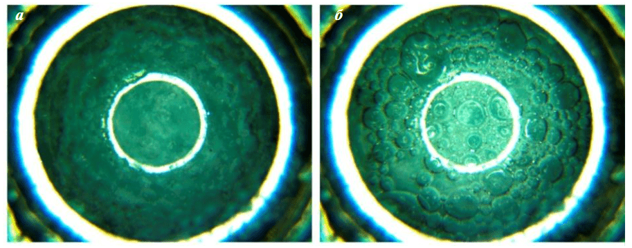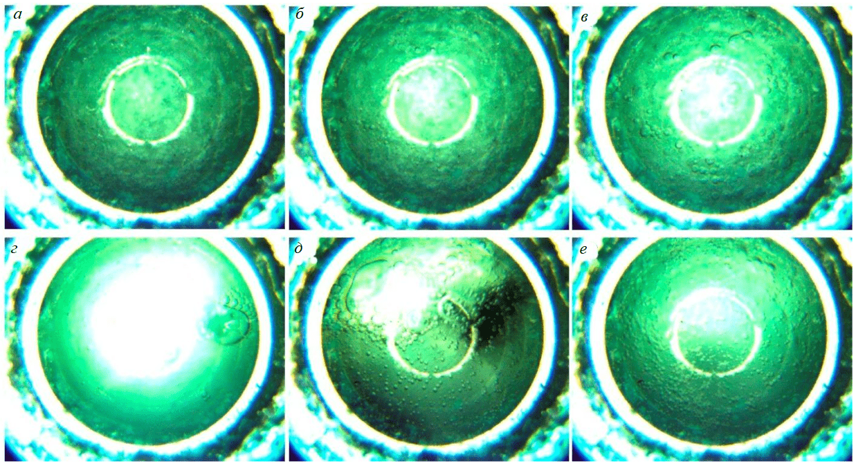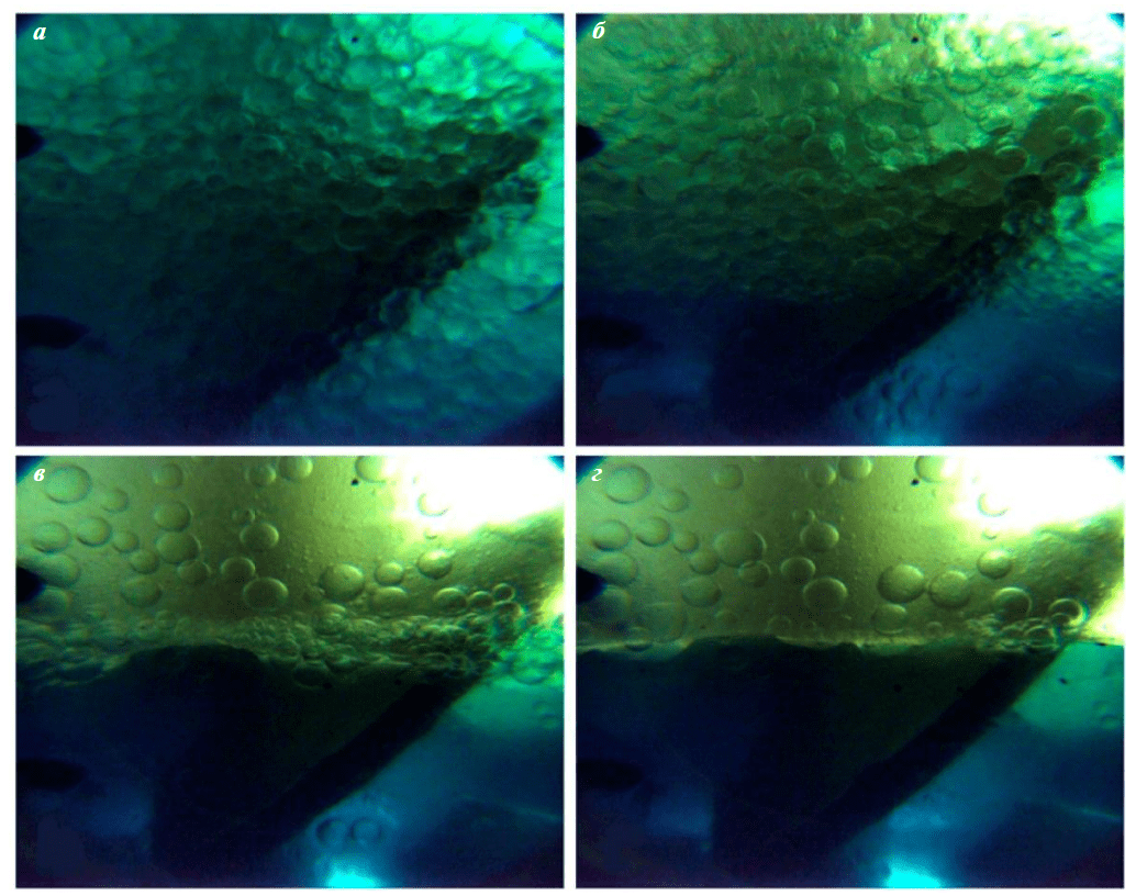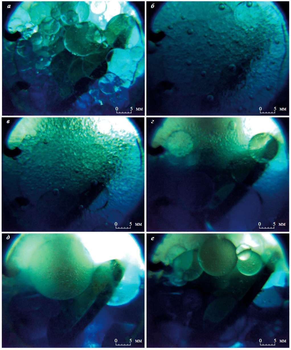 Известно, что диссоциация газовых гидратов инициируется за счет уменьшения давления или повышения температуры. После понижения давления в автоклаве с 35 до 25 МПа наблюдается выделение пузырьков газа малого размера 0,2-0,8 мм из гидратов и накопление их в замкнутом пространстве (рис.7, б). Пузырьки сливаются и формируют большие пузырьки размером 1-5 мм. По накоплении критического объема газа (через 70-90 с после начала изменения давления) пузырьки разрушаются, и газ вырывается наверх (рис.7, в). Процесс диссоциации интенсифицируется с высвобождением первых пузырьков, и через 30-40 с наблюдается увеличение их размера с 0,2-0,8 до 0,8-5 мм (рис.7, г), они покрывают более 70 % поверхности смотрового окна. Слияние маленьких пузырьков в большие и их высвобождение продолжается 40-60 с, после чего размер образующихся пузырьков вновь уменьшается до 0,2-0,8 мм, и образуются отдельные слияния в пузырьки до 5 мм (рис.7, д, е).