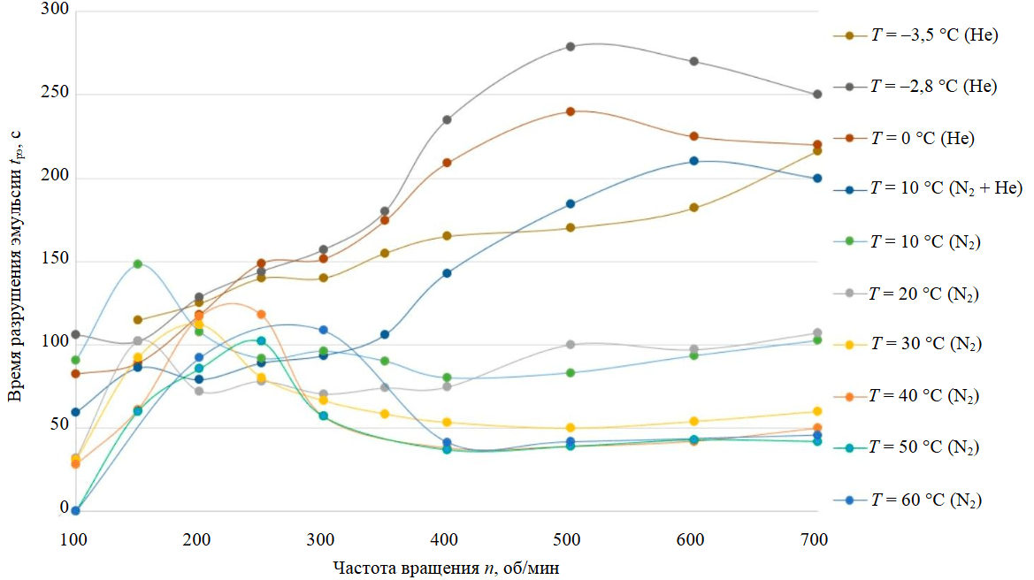 - интенсивность перемешивания во многом влияет на дисперсность (с увеличением интенсивности перемешивания уменьшаются размеры глобул) и время разрушения эмульсий (опыты с использованием азота показали точки максимума при частоте вращения мешалки n= 150-300 об/мин, с использованием гелия при частоте вращения мешалки n= 600-700 об/мин).
