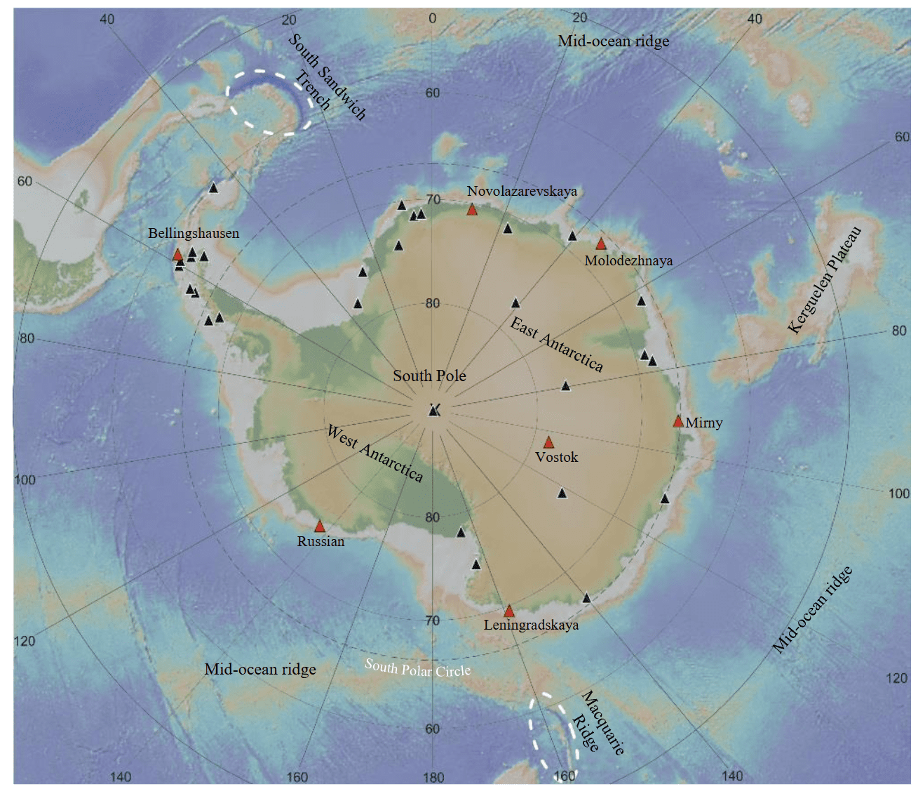 Fig.1. General map of the South Polar Region (based on [4] with additions). White ovals are areas that generate tsunamis from strong seismic events; red triangles are the locations of Russian stations; black ones are foreign seismic stations operating in Antarctica