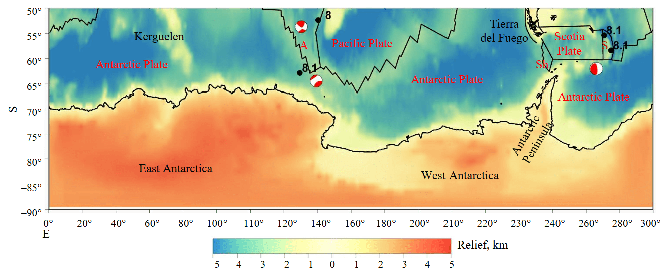 The main object of the study is seismic events in the South Polar Region. In turn, seismicity is determined by the stress state of the region and the rheology of its blocks. Strong earthquakes occur mainly at the boundaries of lithospheric plates (Fig.2). In the South Polar Region, most events are recorded in the Sandwich subduction zone, as well as in the area of the Antarctic Mid-ridge and the Macquarie Ridge [28, 29]. Here, events with a magnitude of Мw > 8 were found. Let us consider the strongest earthquakes of the South Polar Region. Fig.2 shows earthquakes with Mw > 8 south of 50 deg S. Four earthquakes with Mw > 8 occurred south of the 50th parallel: two in the Sandwich subduction zone (1929, Mw = 8.1; 2021, Mw = 8.1); one in the Macquarie Ridge area (1989, Mw = 8) and one in the Balleny Islands area (1998, Mw = 8.1) inside the Antarctic Plate (see Table).