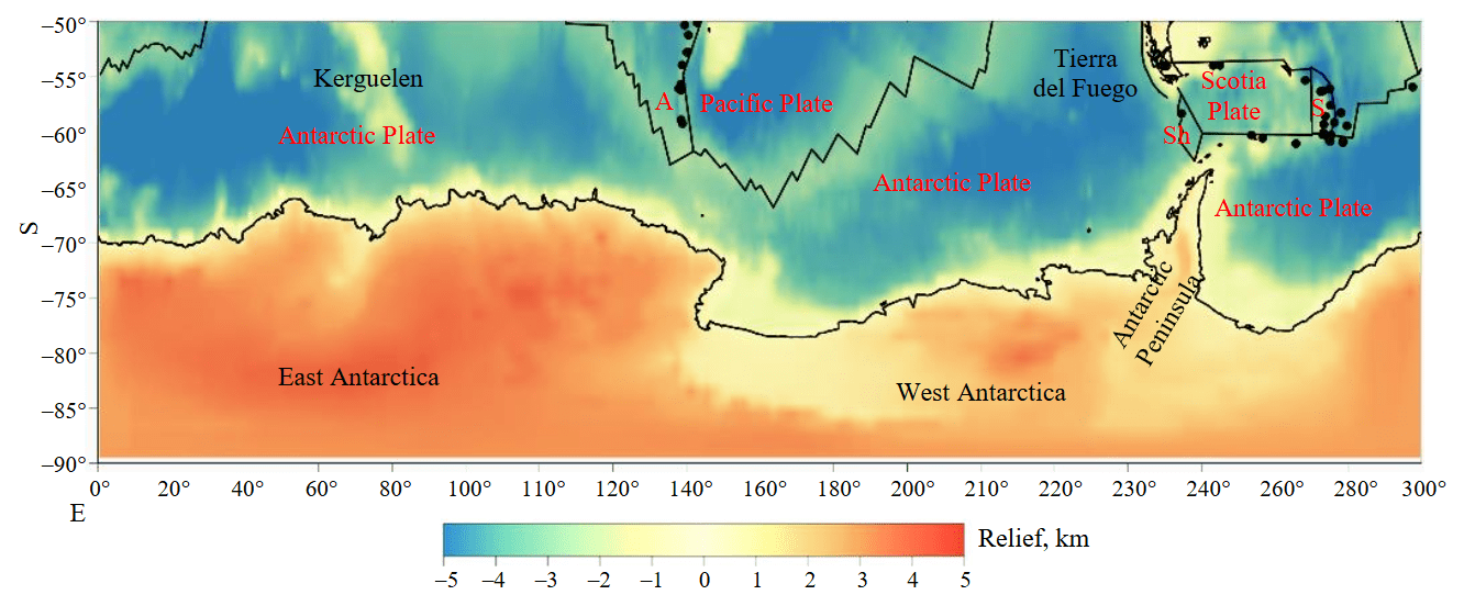 The formation of the Antarctic Plate began during the breakup of the supercontinent Gondwana [2, 3]. During the breakup of Gondwana, Antarctica moved south, forming and developing a divergent boundary with Australia. The rupture of the continental isthmus between Antarctica and South America about 35 million years ago, as well as the opening of the ocean between Australia and Antarctica, led to the isolation of Antarctica, the emergence of the Antarctic Circumpolar Current (Western Wind Current), followed by complete glaciation and general cooling of the climate [5, 6]. Currently, the prevailing horizontal movement of the Antarctic Plate is estimated at about 1 cm/year towards the Atlantic Ocean [7-9].