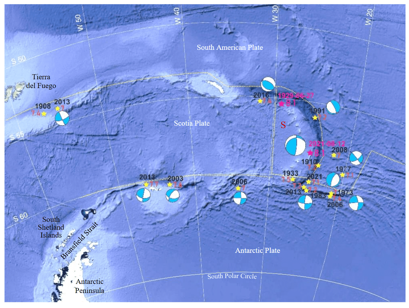 S – Sandwich Microplate; yellow stars indicate epicenters of earthquakes with 7 ≤ Mw < 8, pink ones – with Mw ≥ 8. The sizes of the focal mechanism designations correspond to different magnitudes – large for Mw ≥ 8, smaller – Mw ≥ 7