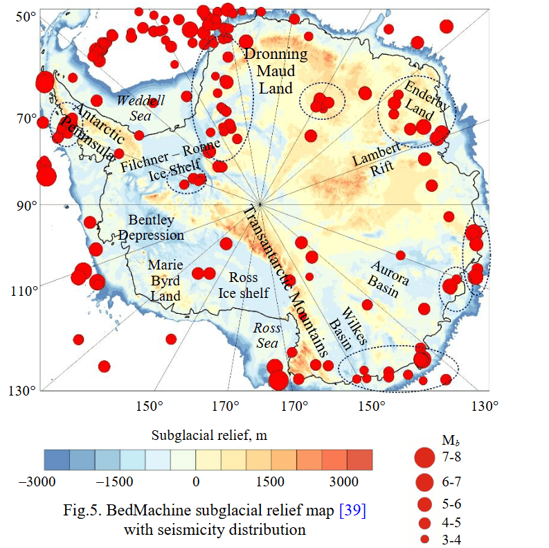 Fig.5. BedMachine subglacial relief map [39] with seismicity distribution