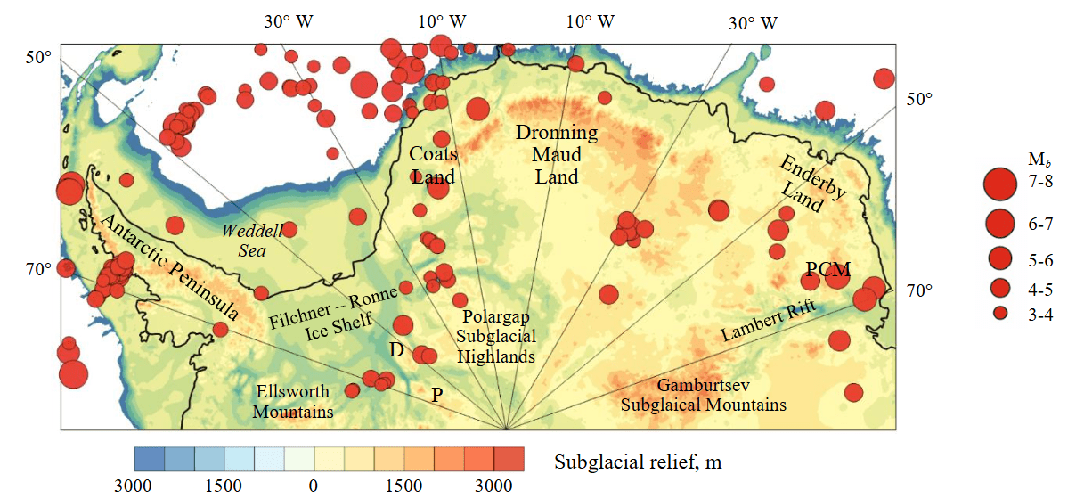 Figure 6 shows earthquakes with Mb > 3 south of 65° S of the Indo-Australian Block of East Antarctica and part of West Antarctica (the Antarctic Peninsula, the Ellsworth Mountains and Filchner – Ronne Ice Shelf). Seismicity at the boundary of West and East Antarctica in the area of Coats Land is associated with ongoing tectonic processes – rifting in narrow subglacial basins of Coats Land. Further south, seismicity is also associated with basins around the boundaries of the Filchner – Ronne Basin with the Dufek Block and the Pensacola Mountains. Further to the east, compact seismicity with magnitudes greater than 4 of unknown genesis was discovered in the central part of Dronning Maud Land.