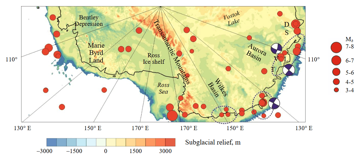 Weak seismic events are mainly concentrated near the coast of the continent, but there are also rare events inside the continent. In coastal areas, events with a magnitude of Mb > 5 have been recorded. At the same time, in the central areas, where the ice is several kilometers thick, seismicity is suppressed by the ice cover, but rare events with magnitudes up to 5 have been detected. The main areas with a concentration of seismi-city are highlighted by black ovals in Fig.5.