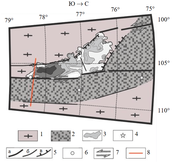 1 – комплексы древней (AR-PR1) коры; 2 – комплексы межблоковой зоны протерозойского заложения; 3 – изобаты озера Восток по [18]; 4 – эпицентры землетрясений по [3]; 5 – разрывные нарушения (а – главные, б – второстепенные, в – сбросы); 6 – станция Восток (скважина 5Г); 7 – сдвиговые дислокации; 8 – расчетный профиль