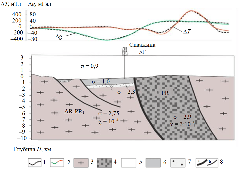 1 – наблюденное поле; 2 – рассчитанное поле; 3 – комплексы древней (AR-PR1) коры; 4 – комплексы межблоковой зоны (PR); 5 – ледниковый слой; 6 – водный слой; 7 – донные отложения; 8 – разрывные нарушения (а – главные, б – второстепенные); σ – плотность, г/см3; γ – магнитная восприимчивость