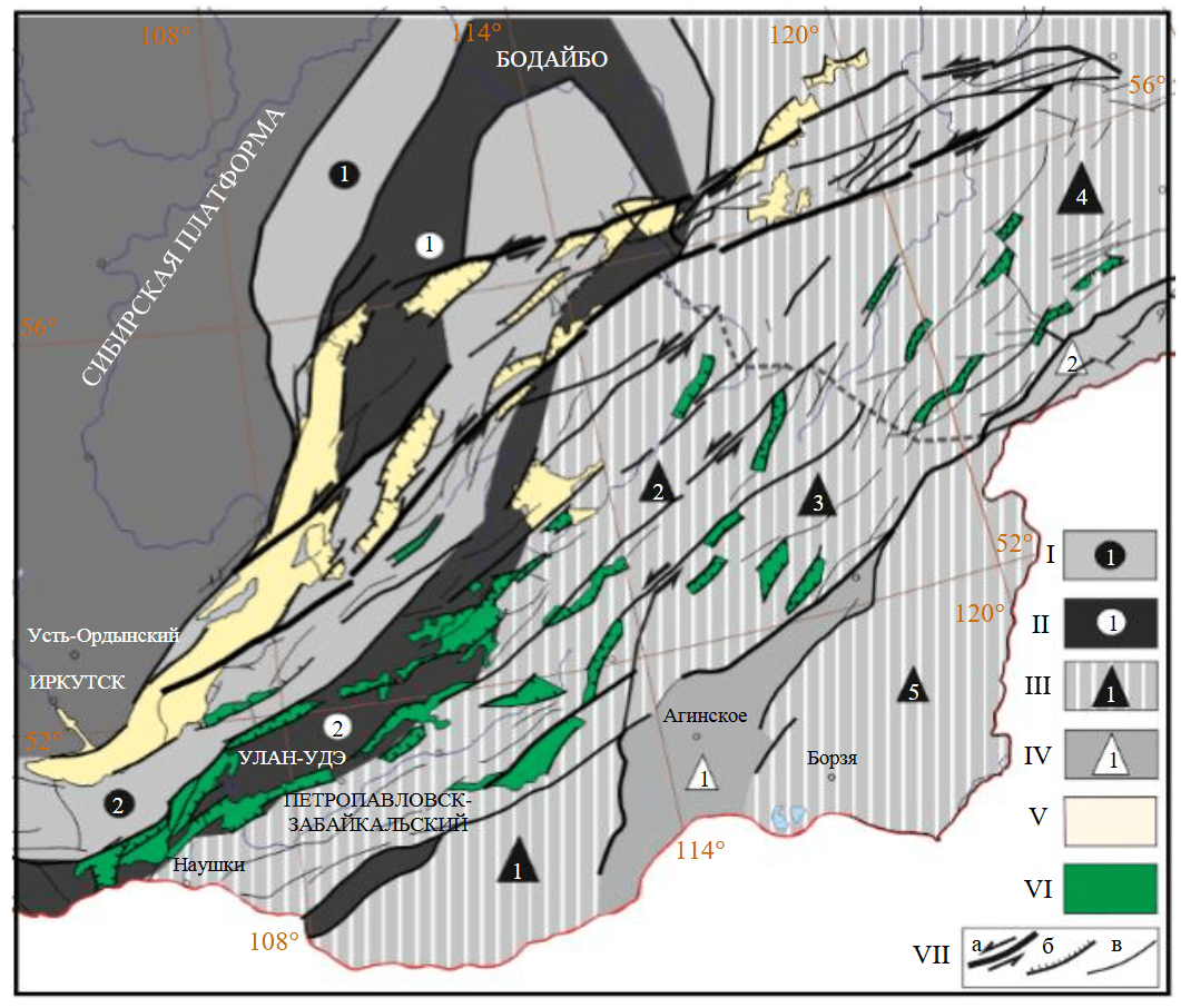 I – блоки эпикаледонской складчатости: Байкало-Патомский (1), Баргузино-Витимский (2); II – межблоковые эпикаледонские сутурные зоны: Байкало-Витимская (1), Хилок-Витимская (2); III – блоки эпикиммерийской складчатости: Чикойский (1), Хилок-Витимский (2), Шилкинский (3), Становой (4), Аргунский (5); IV – белые треугольники – межблоковые эпикиммерийские зоны: Онойская (1), Монголо-Охотская (2); V – кайнозойские рифтовые впадины; VI – мезозойские рифтогенные впадины; VII – разломы: а – сдвиговые генеральные дислокации, б – второстепенные (примитивной сбросовой кинематики), в – прочие разломы неустановленной кинематики более низких рангов. Пунктиром показаны границы между структурами