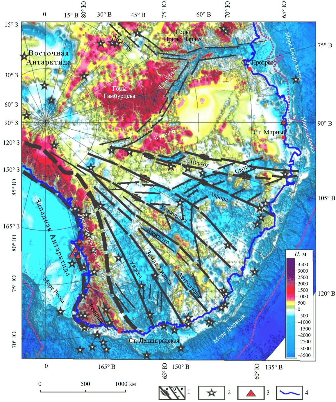 Рифтогенные впадины Аврора и Конкордия.Характерной особенностью этих впадин является более крутой склон восточного борта в сравнении с западным. Для этих структур предполагается постмезозойская тектоническая активность растяжения [33, 34]. Подледниковый бассейн Аврора вместе с рифтом Скотта образует сложную систему депрессий и рассматривается как восточное звено единой рифтовой системы Аврора – Скотта. В бассейне Аврора отмечается наличие эпицентров землетрясений [29].