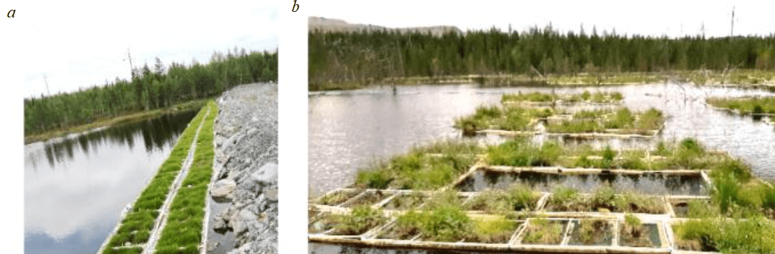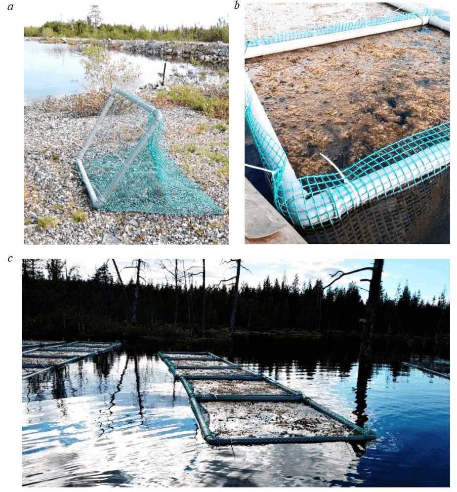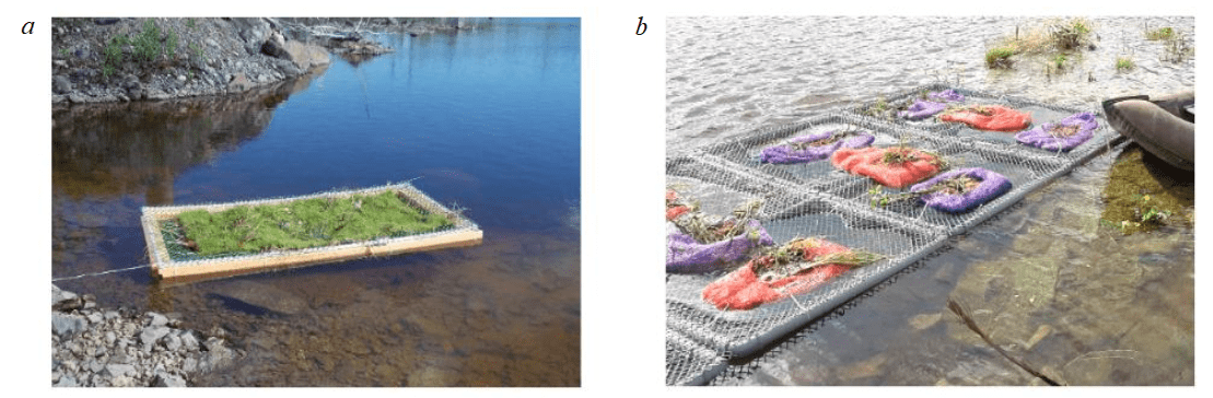 Figure 1 shows a patented design of a floating bioplatform phytomodule [26] used for testing quarry water treatment technology at the settling pond of AO Olkon (Olenegorsk, Murmansk Region) [12]. The structure includes a rectangular base frame constructed from plastic pipes 1 and 2 m long, with diametres of 20 or 50 mm, connected at right angles with elbows. A plastic grid with 3×3 cm cell size, covering an area of 2 m2, is placed on the frame. This serves as a bio-loading platform for pre-grown carpet-like grass turf (Fig.1, a) or phytomats [27] (Fig.1, b), both planted with marsh plants [28].
