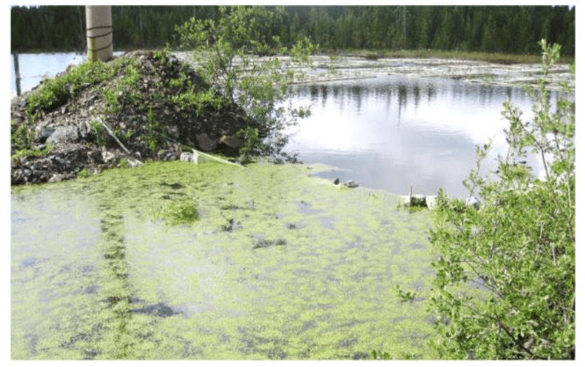 In northern conditions, based on existing experience, the following plants can be recommended for use as biological loading for floating bioplatforms: red fescue (Festuca rubra), grey foxtail (Elytrigia intermedia), perennial ryegrass (Lolium perenne), timothy grass (Phleum pratense) – for forming carpet-like grass turf [28]; white-winged marsh plant (Calla palustris), marsh trefoil (Menyanthes trifoliata), goat willow (Salix caprea), tea-leaved willow (S. phylicifolia), creeping buttercup (Ranunculus repens), coltsfoot (Tussilago farfara), various sedges, narrow-leaved cotton-grass (Eriophorum angustifolium), cotton-grass (E. vaginatum), Scheuchzer’s cotton-grass (E. scheuchzeri), marsh cinquefoil (Comarum palustre), sphagnum mosses (Sphagnum spp.), marsh horsetail (Equisetum palustre), stream horsetail (E. fluviatile) – native bog species for additional planting in the created vegetation cover[27]. In open water areas with shallow depths (to 1 m) in backwaters, it is possible to use goat willow and tea-leaved willow, marsh marigold (Cáltha palústris), creeping buttercup (Ranunculus repens), floating hook-moss (Warnstofia fluitans), floating pondweed (Potamogeton natans), duckweed (Fig.4), common water-pepper (Hippuris vulgaris), marsh horsetail and stream horsetail.