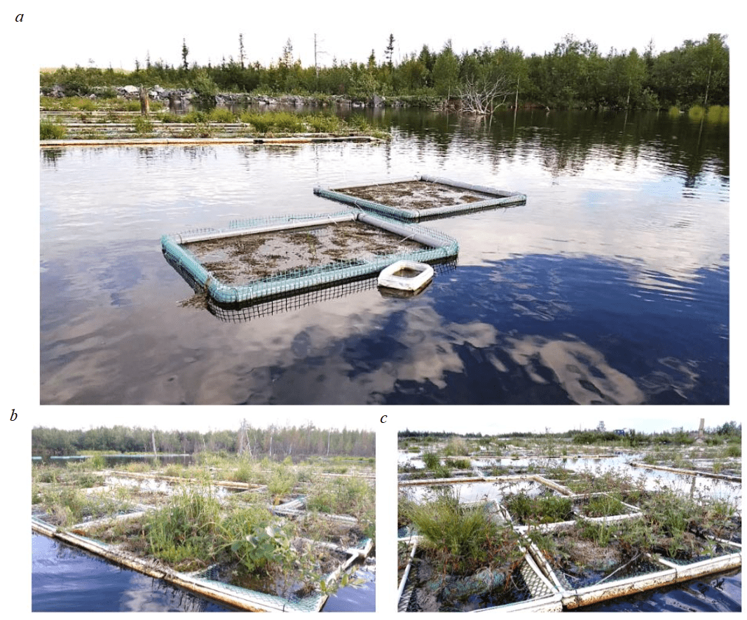In [49], it is provided an example of the formation of an aquatic biocenosis in areas where CFW was applied on the Chicago River (USA), where the activity of zooplankton, insects, amphibians, reptiles, fish, and birds was noted in areas occupied by floating plant structures. Research [28] noted the active colonization of the floating bioplatform area by mosses and higher plants not included in the artificial phytocenosis, as well as the appearance of frogs, ducks, waders, hares, otters, and mice. The condition of the plant phytomodules observed in this study at the quarry water settling pond in 2024 is shown in Fig.5, 6.