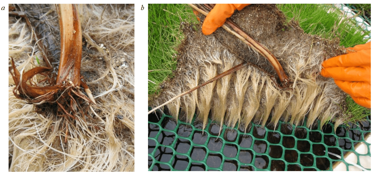 Fig.6. Root system condition of plants on floating phytomodules: a – Scheuchzer’s cotton-grass; b – turf