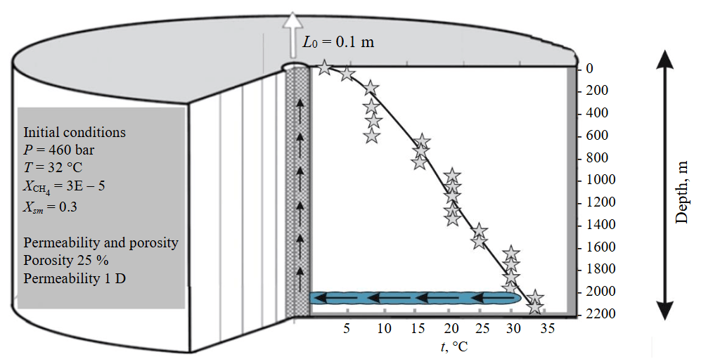 A production well in a radial-cylinder (RZ) coordinate system penetrates the target reservoir at a depth of 2 km; on the left – information on the initial conditions in the target reservoir and its porosity and permeability; on the right – a graph of temperature variation with depth (marked by asterisks) in the cap rock of the enclosing formations; arrows – movement of brine from the target reservoir upward through the well; ХСН4 – mass fraction of methane; Хsm – mass fraction of salt in the solution