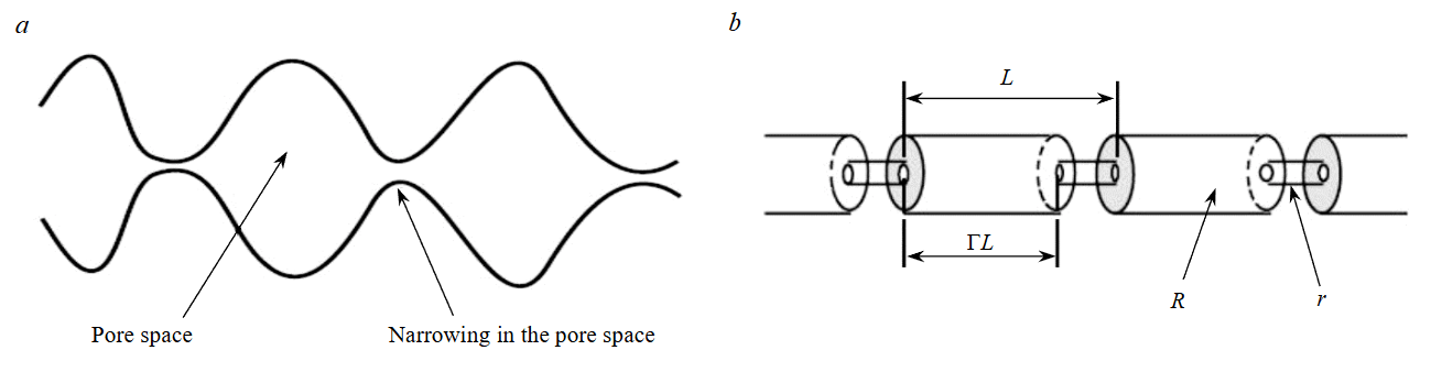 Although in models of straight capillary tubes the permeability remains non‑zero until porosity reaches zero, in models of tubes with variable channel radii the permeability drops to zero at non‑zero porosity. For the model shown in Fig.5, the following relationship holds [39]: